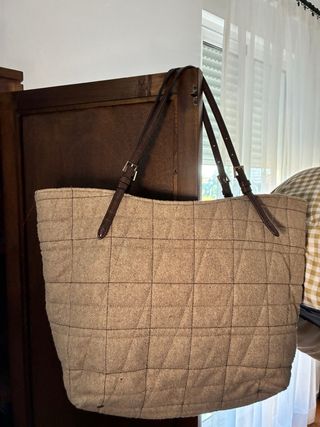 Bolso grande de tela en color beige con un diseño acolchado y costuras marcadas. Las asas son de un marrón chocolate. - Diseño acolchado a cuadros. - Asas de material resistente.