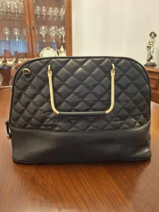 Bolso de piel en excelente estado. - Material: Piel. - Color: Negro. Detalles metálicos dorados. - Cierre de cremallera. - Asas cortas y también bandolera