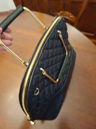 - Material exterior: piel sintética. - Diseño acolchado tipo diamante. - Asa de mano metálica dorada. - Cierre de cremallera superior.