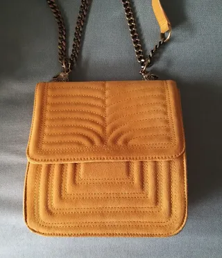 Bolso de bandolera de Zara que se puede llevar también de hombro. - Material tipo ante de color mostaza. - Diseño acolchado con pespuntes. - Cadena metálica de color envejecido. - Cierre de solapa. - Tiene detalles de cabeza de lobo en metal para sujetar la correa. Tamaño 21x23x9cm. Está perfectamente, solo tiene un poco de roce en la parte trasera, penúltima foto, pero no está estropeada.