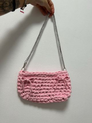 Bolso de mano tejido a mano con un diseño moderno y juvenil. Perfecto para complementar tu estilo. - Tejido de crochet. - Asa de cadena plateada. - Cierre con lazada.