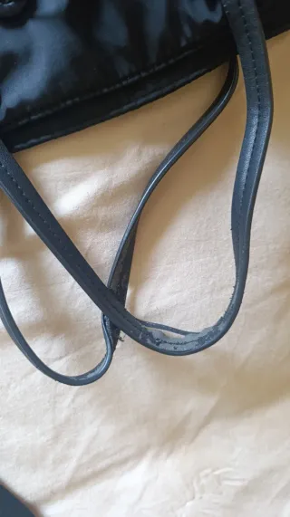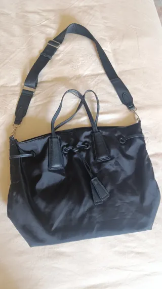 Bolso de nylon negro de Zara grande, tiene las asas cortas peladas - Cierre con cordón ajustable. - Dos asas superiores. - Correa de hombro ajustable y extraíble. - Detalle de borlas.