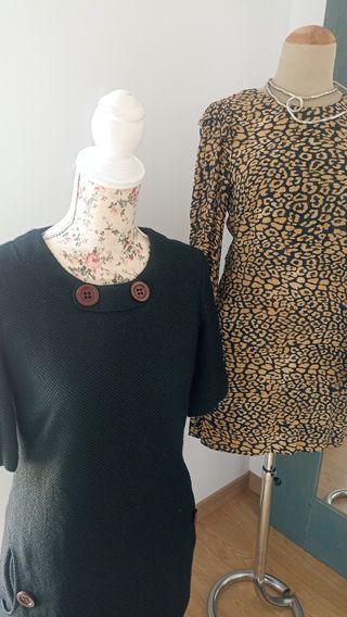 Lote de dos vestidos, uno negro y otro multicolor con estampado de leopardo. - Vestido negro con detalles de botones. - Vestido estampado de leopardo con cuello redondo y mangas largas. - Incluye bolso de mano a juego. El vestido de animal print de zara y el otro de Pullandbear