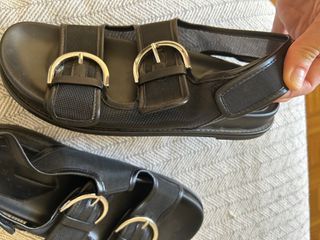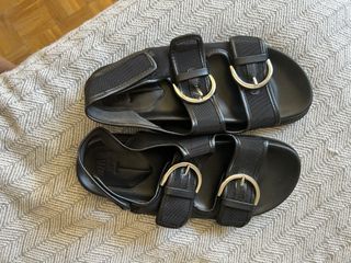 Sandalias de Zara en diseño mesh color negro con hebillas doradas ajustables y tira con Velcro en la parte de atrás. Se entregan en bolsa de Zara . Muy muy poco uso , están impecables