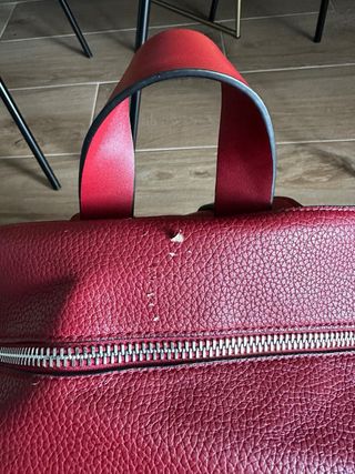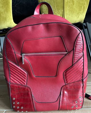 Mochila con un diseño moderno y llamativo. Tiene un arañazo en la zona superior y otro en el lateral como se aprecia en las fotografías. Se ha usado muy poco. MEDIDAS: 40 alto x 32 ancho x 15 profundidad. - Efecto piel. - Color rojo vibrante. - Detalles texturizados y con acabado de cocodrilo. - Abertura superior con cremallera. - Compartimento frontal con cremallera.