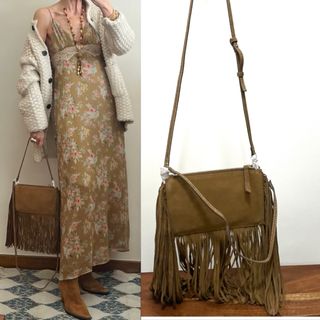 100% piel ante color beige oscuro Doble tira de flecos Dos compartimentos interiores Cierre cremallera Dos asas independientes con dos longitudes y mosquetones para ajustar, se pueden llevar juntas Nuevo no negociable Entrego en funda de tela original Madrid entrega en mano opcional