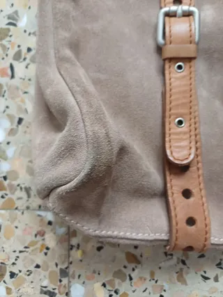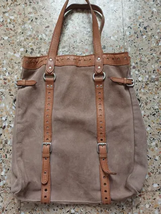 Bolso de ante con detalles en piel. - Material: Ante y piel. - Color: Marrón y beige. - Diseño con tiras y hebillas. - Acabado con perforaciones en la parte superior.