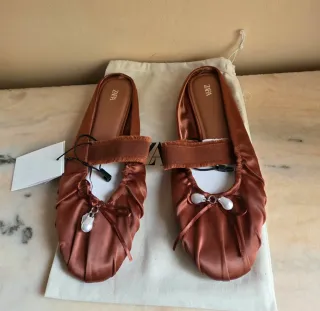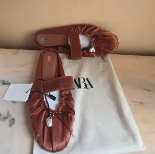 Elegantes bailarinas de Zara con un acabado satinado y detalle de perlas. Número 38 Se envía con bolsa protectora Nuevo con etiqueta sin estrenar Gastos de envío por cuenta del comprador. No se hace contra reembolso - Color marrón dorado. - Diseño fruncido. - Tira elástica con acabado festoneado. - Adorno de lazo con perlas.