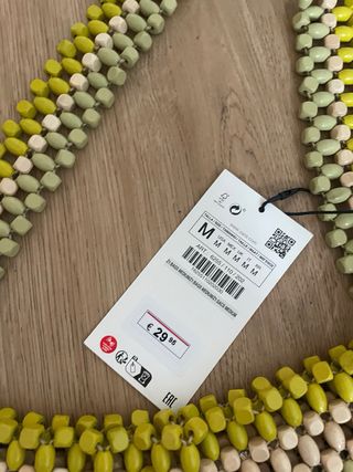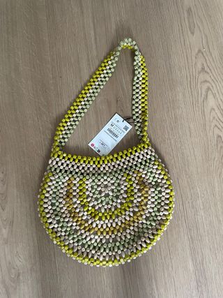 Precioso bolso de Zara, ideal para darle un toque de color a tu look. Está prácticamente nuevo, con su etiqueta original. - Diseño único con cuentas de madera en tonos verdes y amarillos. - Asa para llevarlo cómodamente al hombro. - Perfecto estado de conservación.