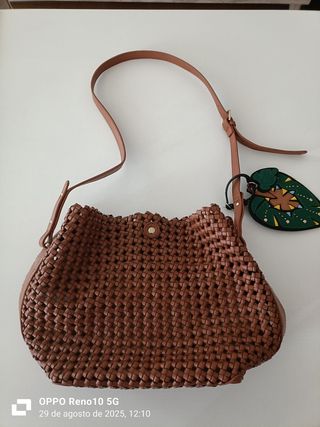 Precioso bolso bandolera de Zara. Es de color marrón y tiene un diseño trenzado muy original. - Asa larga regulable para llevarlo al hombro o cruzado. - Cierre superior con botón a presión con bolsa tela interior. - Incluye un pequeño charm con forma de hoja.