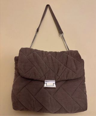 Bolso de mano o al hombro con un diseño acolchado y moderno. - Material: Pana. - Cierre de solapa con broche metálico. - Correa combinada de cadena y tejido. - Detalle de pespuntes en rombos. Usado