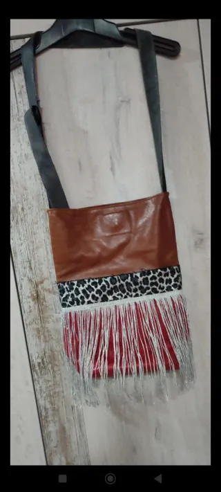 Bolso marrón y rojo con flecos tipo cubo