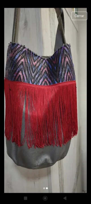 Bolso con un diseño llamativo y detalles únicos. Hecho en piel - Parte superior con estampado geométrico multicolor. - Adorno de flecos largos en color rojo. - Base de cuero sintético gris. Muy buen estado