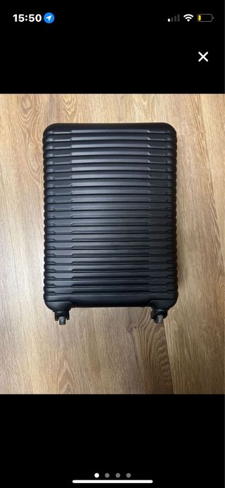 Maleta de viaje negra con un diseño de líneas horizontales. (incluye ropa y zapatos) - Diseño de líneas horizontales. - Cuatro ruedas para facilitar el transporte.