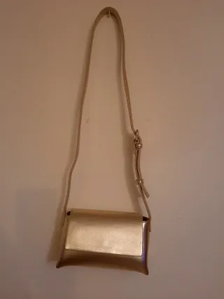 Bolso de mano con un diseño elegante y moderno. - Color dorado metálico. - Correa ajustable. - Cierre de solapa.