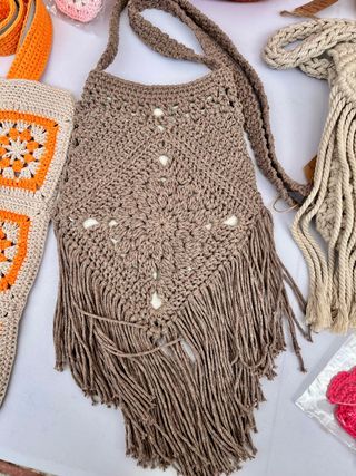 Bolso de macramé tejido a mano con un diseño único. - Material: Cuerda de algodón. - Estilo: Bohemio. - Acabado: Flecos decorativos. 34x24cm