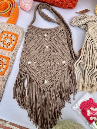 Bolso artesanal de crochet con un diseño único y flecos. - Tejido a mano con hilo de algodón. - Diseño con motivos florales. - Flecos largos en la parte inferior.