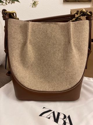 Bolso de Zara sin estrenar, con un diseño moderno y elegante. - Combinación de materiales en beige y marrón. - Detalles de costura en contraste.