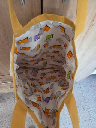 ✨ Tote Bag Artesanal "AMA" - Upcycled Bridal Lace ✨ ¡Lleva contigo una pieza con historia! Esta tote bag está hecha a mano y es totalmente única. El detalle más especial es su espectacular frontal de encaje recuperado de un vestido de novia real, dándole una segunda vida llena de estilo y elegancia. 👰 🌿 Lo que la hace única: Diseño Exclusivo: Marca AMA, creada con mimo y de forma artesanal. 🧵 Materiales con Alma: Tela en un precioso tono mostaza/ocre con el encaje blanco de novia superpuesto. ¡El contraste es ideal! 💛🤍 Interior Sorpresa: Forrada por completo con una tela divertida y colorida de motivos geométricos/libros.