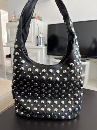 Bolso de mano con un diseño moderno y llamativo. - Adornado con múltiples tachuelas plateadas. - Asa cómoda para llevar al hombro.