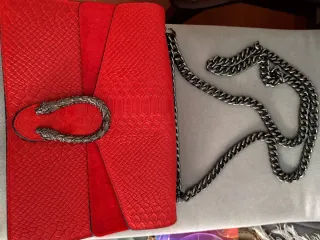 Elegante bolso de mano en color rojo, con un diseño texturizado que imita la piel de serpiente y detalles en ante. Cuenta con un distintivo cierre metálico en forma de cabeza de serpiente y una cadena metálica para llevarlo al hombro. - Textura imitación piel de serpiente. - Cierre metálico con diseño de serpiente. - Cadena metálica. - Detalles en ante.