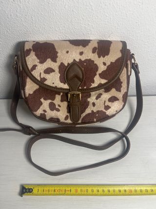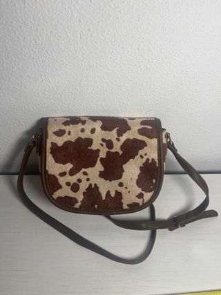 Bolso de mano con un llamativo estampado de vaca y detalles en marrón. - Diseño de moda. - Cierre con hebilla dorada. - Correa ajustable.