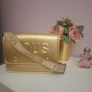 Precioso bolso de la marca Tous en color dorado. Su diseño es elegante y moderno, perfecto para complementar cualquier atuendo. - Correa con logo TOUS repetido. - Cierre de solapa con broche. - Acabado metalizado brillante.