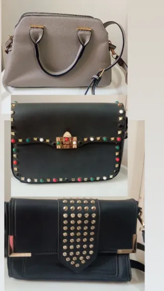 Conjunto de tres bolsos de diferentes estilos. - Bolso gris con asas cortas y correa. - Bolso negro con tachuelas y cierre metálico. - Bolso negro con tachuelas y solapa.