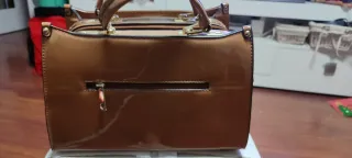 Bolso de charol en tono marrón claro, sin estrenar. - Diseño elegante y brillante. - Cierre de cremallera. - Asa superior para llevar en mano.