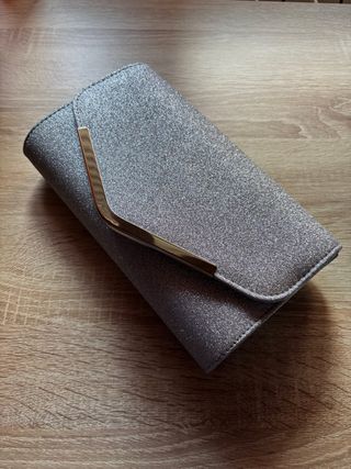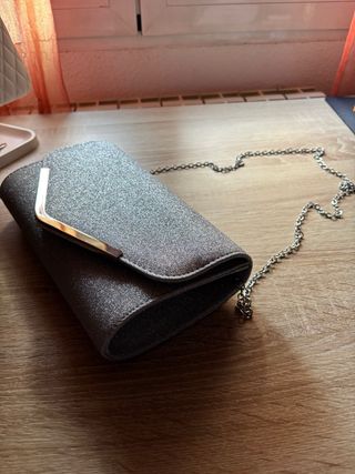 Elegante bolso de mano con acabado brillante. - Diseño moderno con detalle metálico. - Textura con purpurina. solo envio online