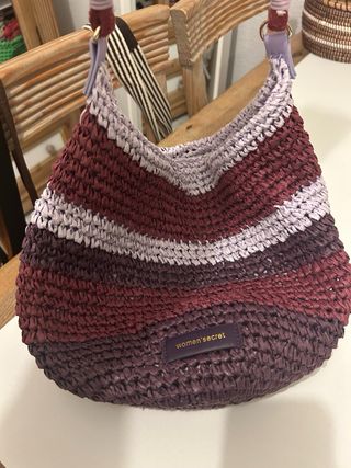 Bolso de mano o al hombro con un diseño trenzado y rayas de colores. Usado en pocas ocasiones, muy buen estado. - Material trenzado. - Cierre de cordón. - Asa de doble cuerda. - Detalle de etiqueta con el logo de la marca. 37cm ancho 25cm diámetro de base