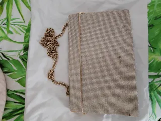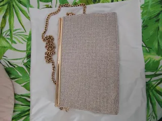 Elegante bolso de mano adornado con pedrería. - Diseño llamativo con detalles brillantes. - Cadena dorada para llevar al hombro o cruzado.