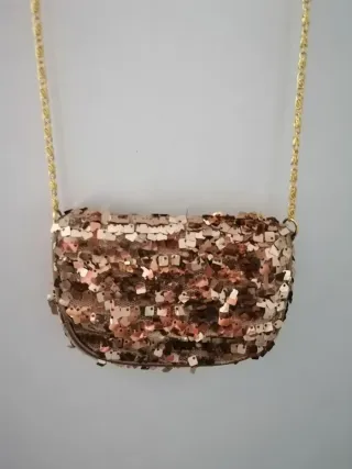 Elegante bolso de fiesta con un diseño de lentejuelas brillantes. - Color dorado y multicolor. - Cadena dorada para llevar al hombro o cruzado.