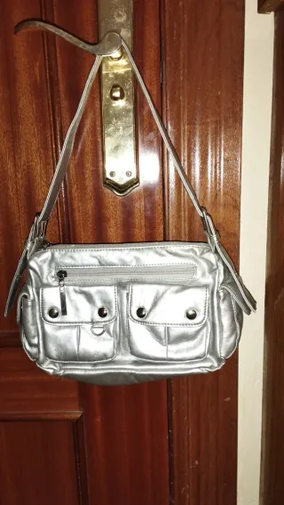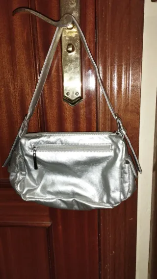 Bolso de fiesta plateado con múltiples bolsillos exteriores e interiores. -Un bolsillo superior frontal con cremallera. - Dos bolsillos frontales con cierre de botones magnéticos. - Un bolsillo trasero con cremallera. - Dos bolsillos laterales con botón magnético. - Dos bolsillos interiores con cremallera. - Un bolsillo interior abierto. - Asa ajustable.