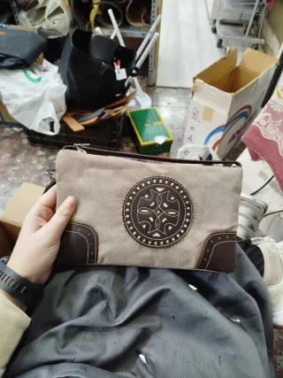 Elegante bolso de mano con un diseño circular decorativo en la parte frontal. Tiene también para hombro - Material exterior de ante. - Detalles en piel marrón. - Cierre de cremallera.