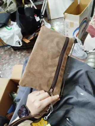 Bolso de ante con polipiel y tachuelas doradas. Suave y tiene bolsillo con cremallera dentro. - Diseño curvo. - Cierre de cremallera. - Correa ajustable.