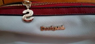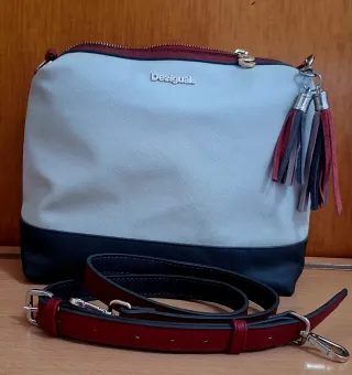 Bolso de la marca Desigual con un diseño bicolor. Contiene 3bolsillos interiores( 2 con cremallera y una sin ella) y otro en la parte de atràs. - Asa larga ajustable de color rojo. - Adornos de flecos. - Cierres de cremallera.