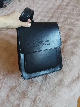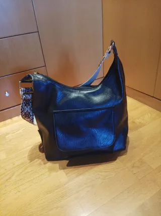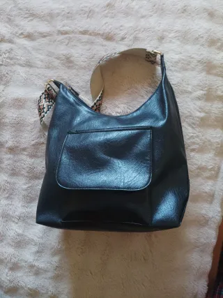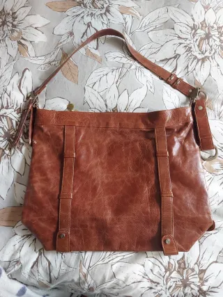 Bolso grande ideal para llevar el portátil, ya que tiene dos compartimentos. El material es imitación al cuero y tiene una cinta ajustable además de las asas.