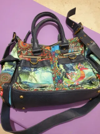 Bolso mediano de la marca Desigual, con un diseño vibrante y original. Nunca ha sido usado. - Estampado floral y geométrico. - Múltiples bolsillos exteriores con cierre de hebilla. - Asa de hombro ajustable.
