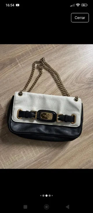 Bolso bandolera con un diseño bicolor. - Cadena dorada. - Detalle de hebillas y placa metálica dorada en la solapa.