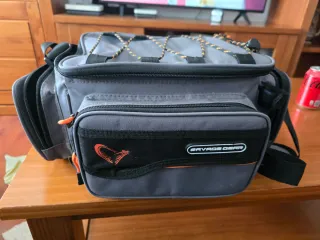Bolso de la marca Savage Gear en tonos grises y naranjas. Cuenta con varios compartimentos para organizar tus pertenencias. - Diseño con cremalleras naranjas. - Logo de la marca visible en la parte frontal. -40 de largo 20 de alto 25 ancho