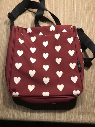 Bolso de la marca Moos con un divertido estampado de corazones. - Diseño en color burdeos con corazones blancos. - Correa ajustable para llevar al hombro o cruzado. - Etiqueta con el lema ALL YOU NEED IS LOVE.