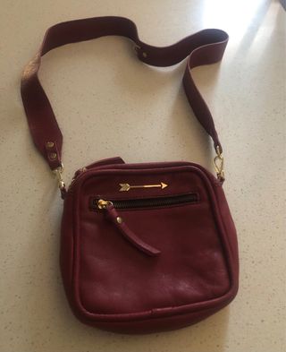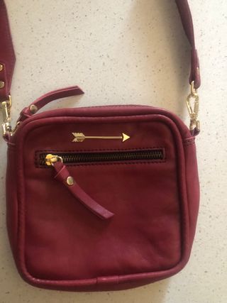 Bolso bandolera granate de piel con flecha dorada.