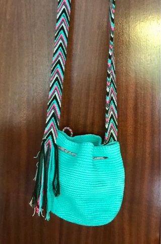 Bolso artesanal de la comunidad Wayuu, tejido a mano con diseños únicos. Traído de Colombia. Combinado en turquesa y rosa con tira para colgar multicolor con flecos. Sin uso. Tamaño mini. - Elaborado con técnicas tradicionales. - Materiales resistentes y duraderos. - Cada bolso es diferente.