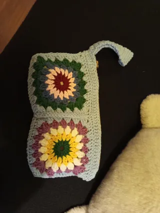 Bolso de mano con un diseño tejido y colorido, perfecto para llevar tus esenciales. - Elaborado con la técnica de ganchillo. - Presenta un asa para facilitar su transporte.