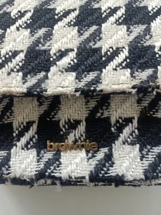 Elegante bolso de hombro con un diseño clásico y llamativo. Perfecto para añadir un toque de estilo a cualquier atuendo. - Estampado de pata de gallo en blanco y negro. - Cadena dorada extraíble para llevar al hombro o cruzado. - Logo de la marca en dorado.