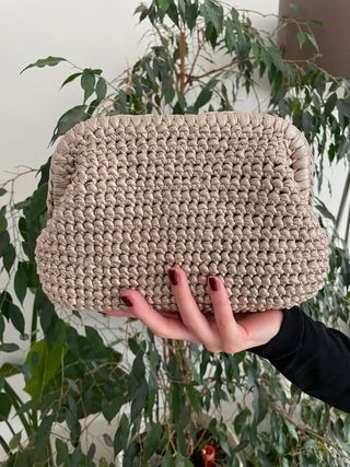 Bolso clutch tejido en cinta de cuero sintética un tono dorado claro. Gran capacidad. Medidas en fotos - Material: cinta de cuero sintética - Color: dorado claro