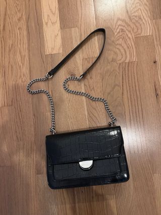 Bolso negro con acabado de cocodrilo. - Cierre con solapa. - Asa de cadena plateada. - Detalle metálico en el cierre.