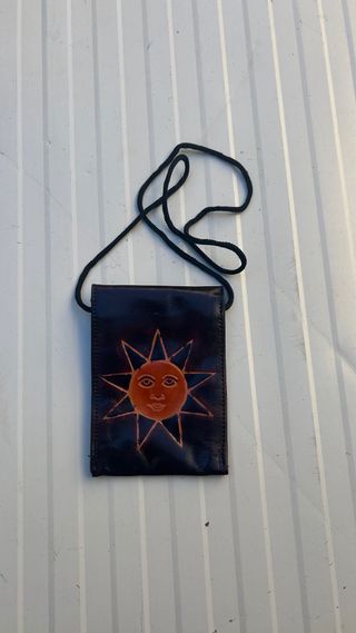 Bolso pequeño con un diseño de sol. - Diseño de sol en relieve. - Correa para colgar.