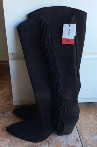 Botas negras estilo cowboy con detalles de flecos. Son NUEVAS de Lefties. Talla 38 - Material exterior de ante. - Detalle de flecos en el lateral. - Punta fina y tacón gordo.